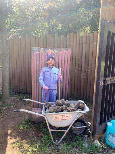 飼育員さんの顔ぬきと、一輪車の中は本物の象さんのウンチです。